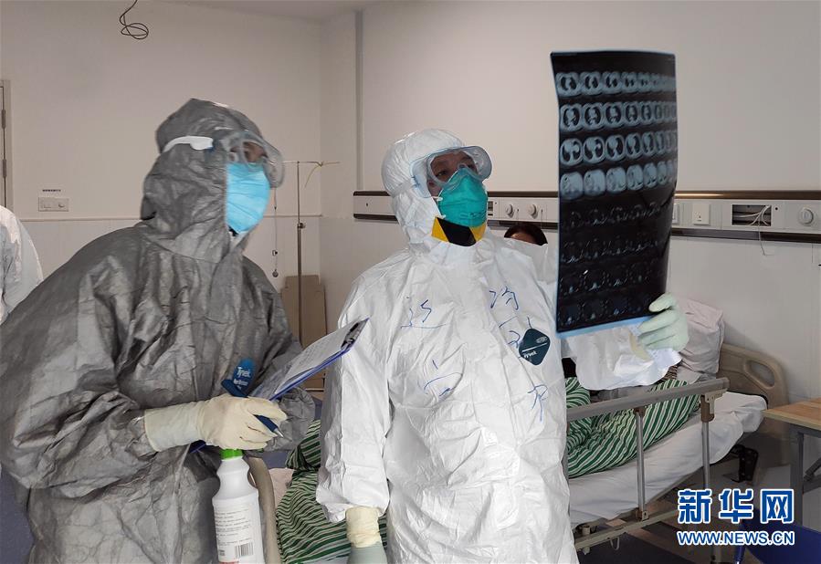 2月22日,中国医科大学附属盛京医院医生冯国和(右)在襄阳市第一人民医院工作。新华社发(盛京医院供图)