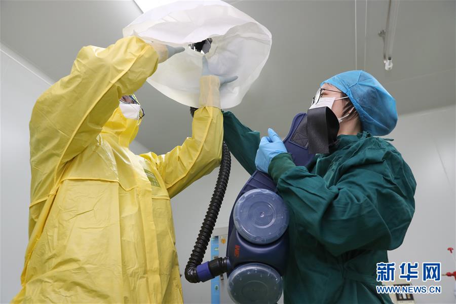 2月25日,郭陈(右)在清洁区帮助季霄雷戴正压面罩。新华社发(许丛军 摄)