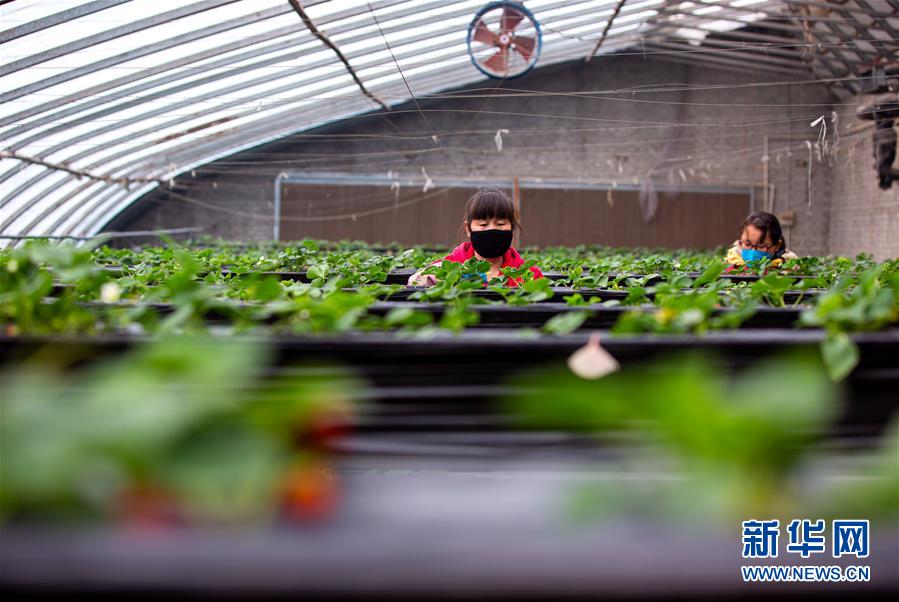 2月25日,河北武安市白沙村村民对大棚内的草莓进行日常管理。 初春时节,气温回升,农民在田间地头忙于农业生产。 新华社记者 王晓 摄