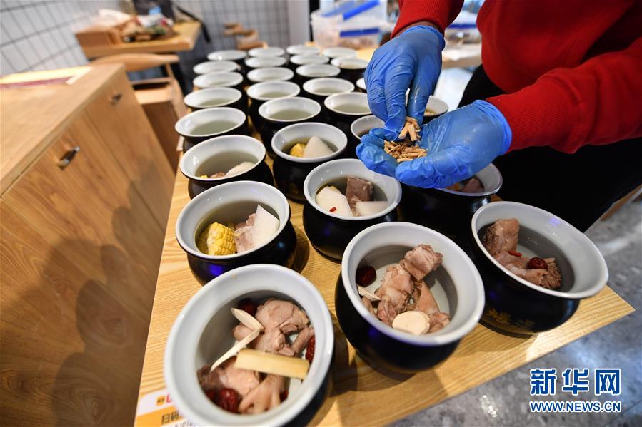 2月25日,一位店员将制作瓦罐汤的食材放入瓦罐,准备放入大瓦缸中进行煨制。 新华社记者 胡晨欢 摄