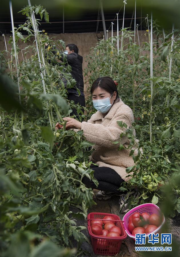 2月26日,渭南市华州区君朝现代设施农业产业园的员工在大棚里采摘西红柿。 新华社记者 陶明 摄