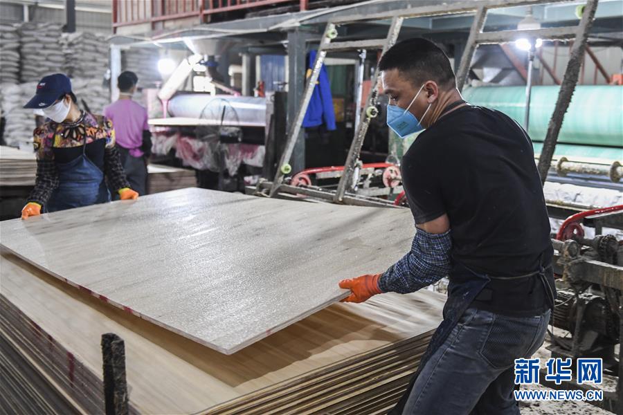 2月26日,在广西贵港市覃塘区的一家板材生产企业,工人在车间内工作。 近期,广西贵港市覃塘区在做好新冠肺炎疫情防控工作的同时,积极推动重点项目和企业复工复产。截至目前,覃塘区内规模以上企业复工复产率已达98%。 新华社记者 曹祎铭 摄