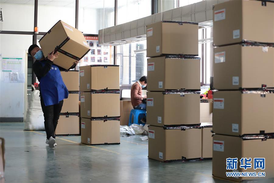 2月25日,浙江省诸暨市一家袜业有限公司的工人把袜子装箱出货。 至2月26日,浙江省诸暨市已有2000多家主营外贸出口的袜业企业基本复工复产,组织员工抓紧完成外贸订单。 新华社发(郭斌 摄)