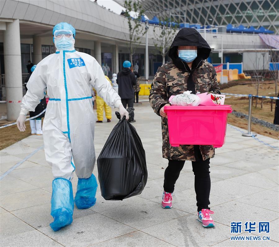 2月26日,治愈患者携带个人物品和医院赠送的鲜花、中药等离开江夏方舱医院。