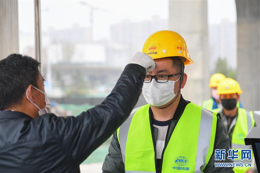 2月26日,在中铁二十五局集团湘府路快速化改造(河西段)项目部门口,工人接受体温测量。 新华社记者 陈泽国 摄