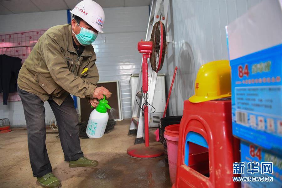 2月26日,在中铁二十五局集团湘府路快速化改造(河西段)项目部宿舍区,工人进行消毒。 新华社记者 陈泽国 摄