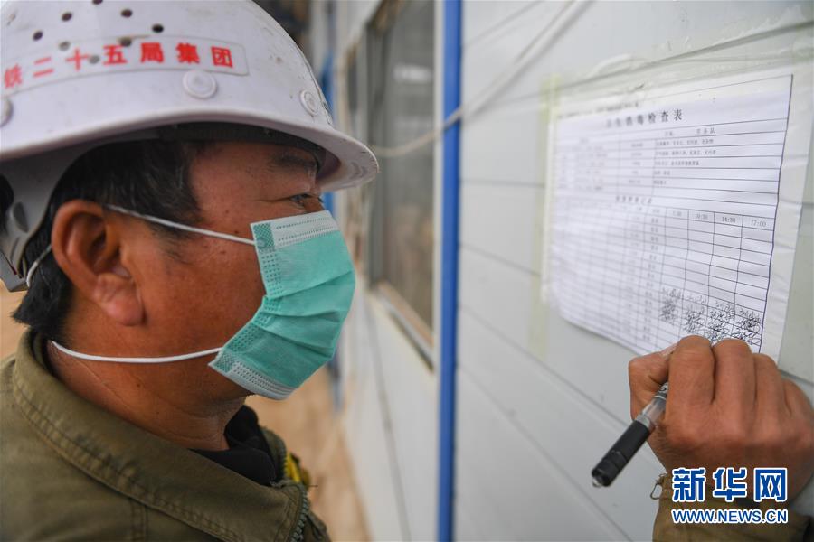 2月26日,在中铁二十五局集团湘府路快速化改造(河西段)项目部宿舍区,工人进行消毒记录。 新华社记者 陈泽国 摄