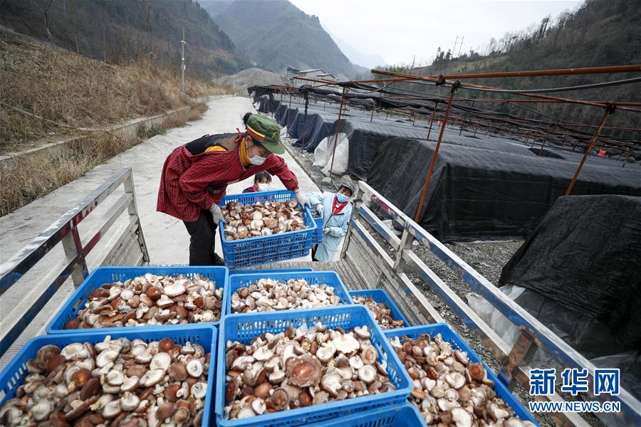 2月24日,在重庆城口县修齐镇花菇扶贫产业生产基地,工作人员将刚刚采摘的香菇装车。新华社发(黄伟摄)