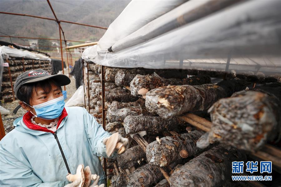 2月24日,在重庆城口县修齐镇花菇扶贫产业生产基地,工作人员在采摘花菇。新华社发(黄伟摄)
