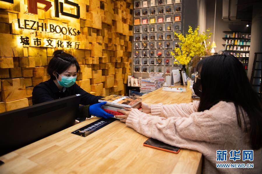 2月26日,在长沙天心区乐之书店收银台,读者在购买图书。 近日,长沙多家书店在防疫物资准备充分、备案后复工营业,市民们走进书店,阅读、选购书籍,充实文化生活。 新华社发(陈思汗摄)