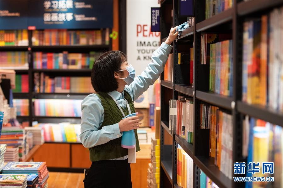 2月26日,在长沙天心区西西弗书店,工作人员给书架消毒。 近日,长沙多家书店在防疫物资准备充分、备案后复工营业,市民们走进书店,阅读、选购书籍,充实文化生活。 新华社发(陈思汗摄)