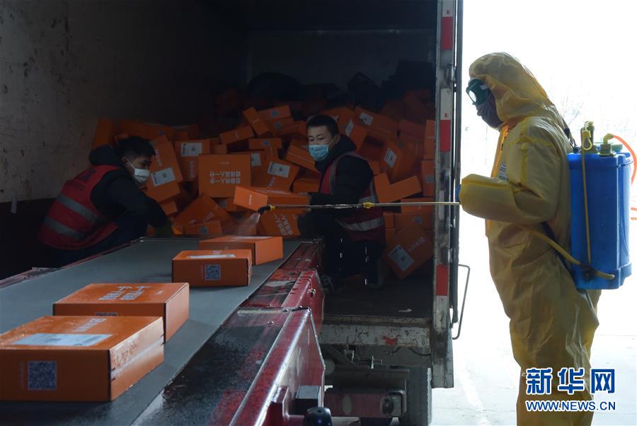 2月26日,员工在顺丰速运(天津)有限公司分拨中心对包裹进行消毒。 近日,天津有序推进快递行业复工复产,截至目前,天津市17家规模以上快递企业分拨(转运)中心已全部开工运营。 新华社记者 周润健 摄