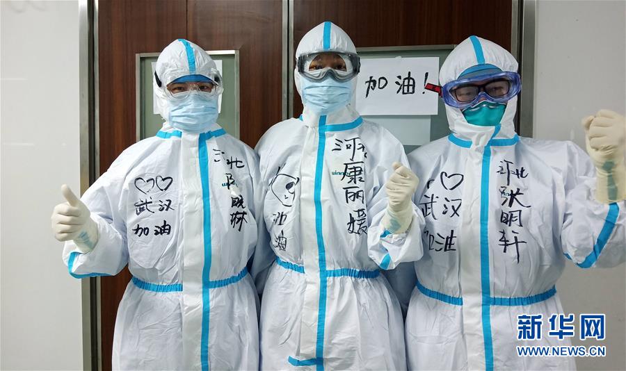 2月24日,在武汉市第七医院ICU,护理组长康丽媛(中)与同事在上班前一起加油鼓劲。新华社发(熊芳 摄)