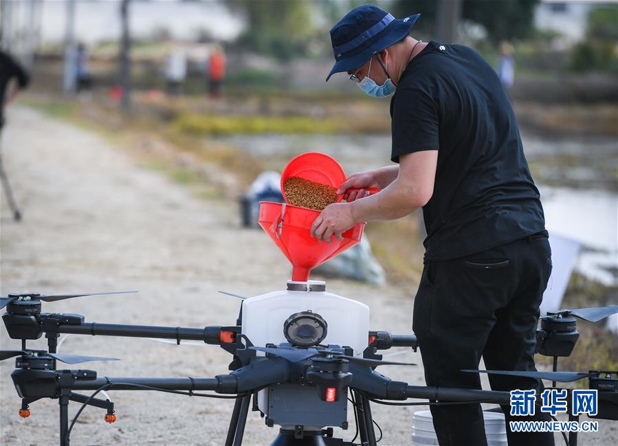 2月26日,在广东江门开平市水口镇,飞手将水稻种子放入无人机。 当日,大疆农业联合广东江门开平市永晖农机专业合作社联合社开展的合作示范田项目开始播种。据了解,大疆农业2020年计划扩大落地示范点,将联合科研院校、企业、代理商等,针对不同作物场景,进行试验,验证无人机工作效果。 新华社记者 毛思倩 摄