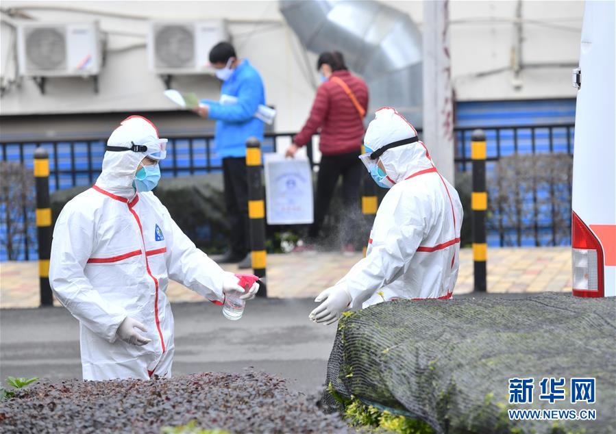 广西桂林南溪山医院救护队医生蒋结振(左)在给同事消毒(2月7日摄)。新华社记者 黄孝邦 摄