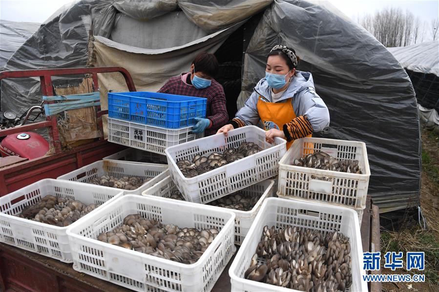2月26日,肥西县铭传乡蘑菇种植基地农民在装运刚采摘的蘑菇。 初春时节,安徽省肥西县铭传乡蘑菇种植基地的农民抓紧采摘蘑菇,供应市场。 新华社记者 刘军喜 摄
