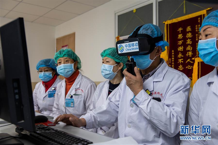 2月26日,医务人员使用VR设备查房。 近日,5G+VR隔离探视系统在昆明医科大学第一附属医院上线,搭建了一条隔离病房里疑似新冠肺炎患者和医生、亲属之间沟通的新渠道。 新华社记者 胡超 摄