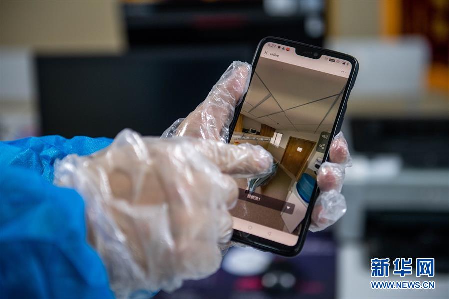 2月26日,工作人员在用手机演示通过5G+VR隔离探视系统看到的隔离病房。 近日,5G+VR隔离探视系统在昆明医科大学第一附属医院上线,搭建了一条隔离病房里疑似新冠肺炎患者和医生、亲属之间沟通的新渠道。 新华社记者 胡超 摄
