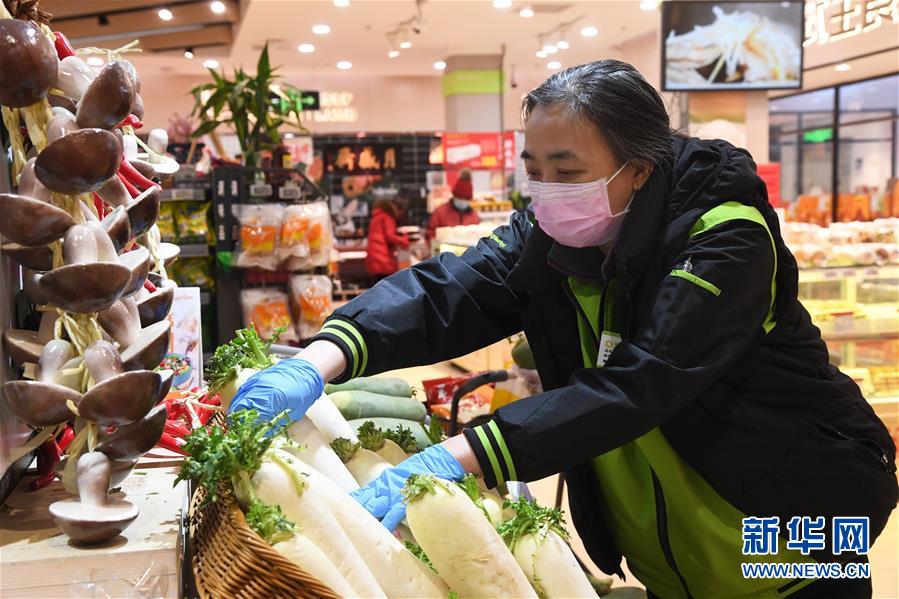 2月26日,在位于海淀区中关村街道的超市发科学城店,工作人员在摆放蔬菜。 新冠肺炎疫情发生以来,北京市海淀区中关村街道的各超市在做好卫生防疫同时,通过设置“1米线”、张贴温馨提示以及对进入超市的顾客进行测量体温等方式,加强超市购物环境管理,保障顾客购物安全。 新华社记者 任超 摄