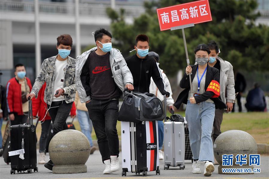 2月26日,在南昌昌北机场,南昌高新区的工作人员引导务工人员前往企业接机的大巴。 当日,江西南昌高新区开通两趟兰州至南昌的“返岗专机”,将首批350余名来自甘肃、青海等地的务工人员接回高新区。连日来,南昌高新区在甘肃、云南、宁夏等地积极对接,帮助企业异地员工返岗和招聘新员工,并开通多趟“返岗专机、专列”。 新华社记者 彭昭之 摄