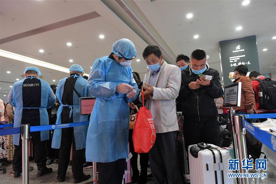2月26日,在南昌昌北机场,务工人员接受健康检查。 当日,江西南昌高新区开通两趟兰州至南昌的“返岗专机”,将首批350余名来自甘肃、青海等地的务工人员接回高新区。连日来,南昌高新区在甘肃、云南、宁夏等地积极对接,帮助企业异地员工返岗和招聘新员工,并开通多趟“返岗专机、专列”。 新华社记者 彭昭之 摄
