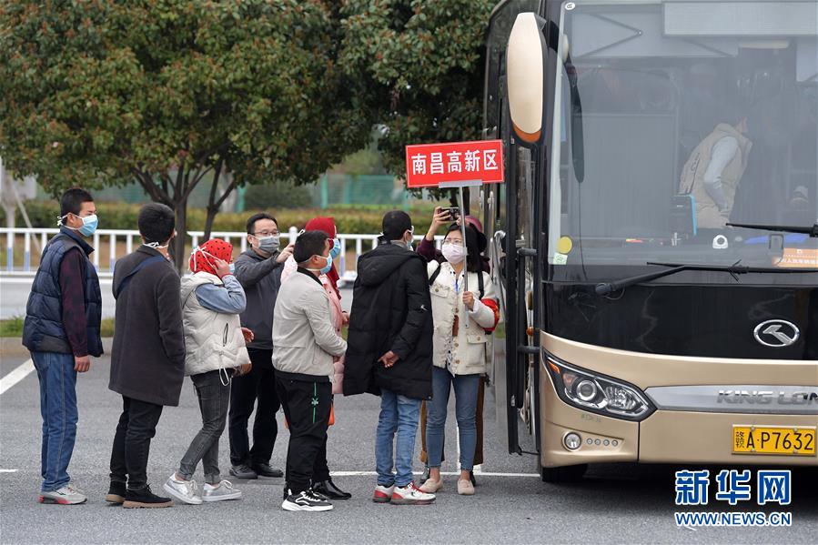 2月26日,在南昌昌北机场,务工人员接受体温检测后登上企业接机的大巴。 当日,江西南昌高新区开通两趟兰州至南昌的“返岗专机”,将首批350余名来自甘肃、青海等地的务工人员接回高新区。连日来,南昌高新区在甘肃、云南、宁夏等地积极对接,帮助企业异地员工返岗和招聘新员工,并开通多趟“返岗专机、专列”。 新华社记者 彭昭之 摄