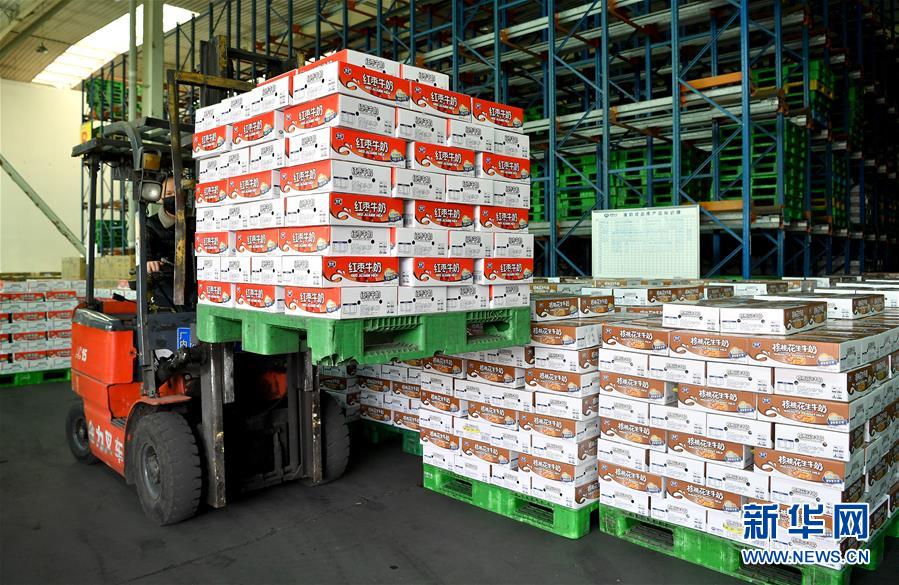 2月26日,工作人员在一家乳制品企业仓储车间搬运乳制品。 新冠肺炎疫情发生以来,陕西西安乳制品企业在做好疫情防控的同时,积极调配人员,有序组织生产,向市场供应乳制品。 新华社记者 刘潇 摄
