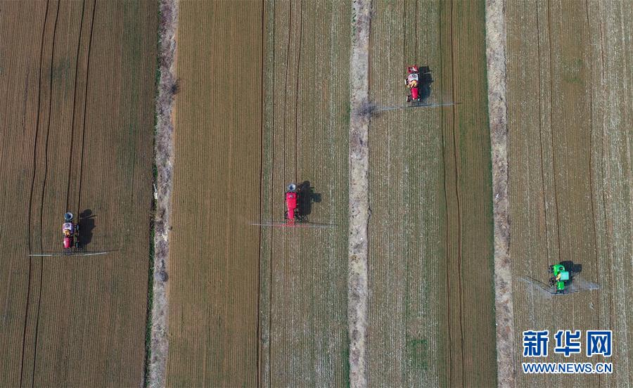 2月26日,在山东省荣成市虎山镇安子山村的小麦田间,农机手驾驶大型植保农机对小麦进行管理作业(无人机照片)。 近日,各地农民抓紧农时,开展农事活动。 新华社发(李信君 摄)