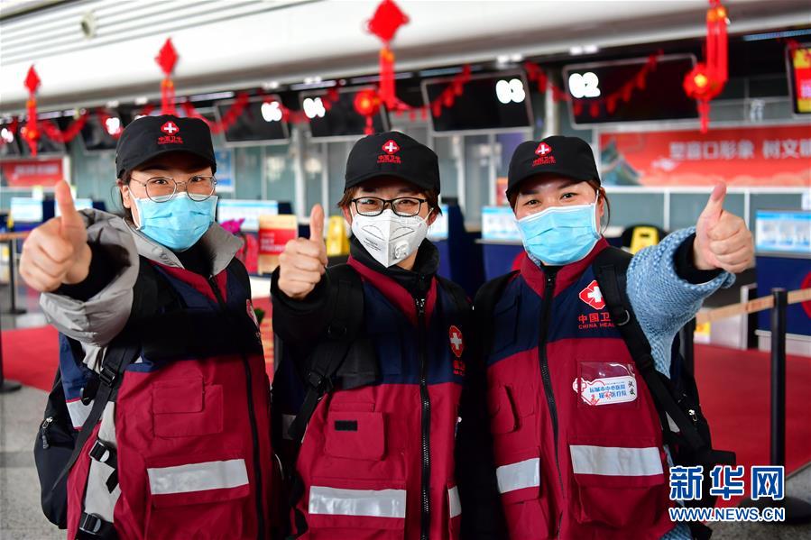 山西省第七批支援湖北医疗队的队员在太原武宿国际机场合影(2月14日摄)。新华社记者 曹阳 摄