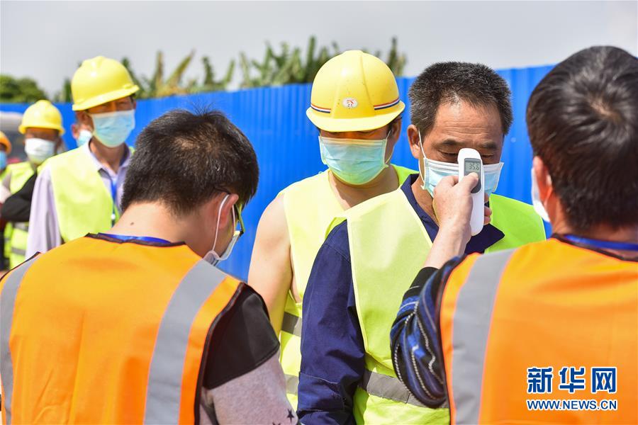 中铁四局工程人员下班离开佛(佛山)莞(东莞)城际铁路石楼段施工现场时接受体温监测(2月26日摄)。该工地2月24号复工复产,目前有120名工人在现场施工。 在粤港澳大湾区重大引水工程珠江三角洲水资源配置工程建设现场,在打通珠江东西两岸快速过江通道的佛(佛山)莞(东莞)城际铁路施工现场,在连接广州5大中心城区的首条地铁环线轨道交通11号线施工现场,吊臂起落、机器轰鸣,建设人员戴着口罩紧张有序作业…… 记者近日走访发现,粤港澳大湾区重大建设项目分区分级精准复工复产,建设现场展露积极气象,同时主体责任单位采取全程掌握复工人员流动轨迹、复工人员核酸检测以及每日统一发放口罩、进出施工现场测量体温、活动场所消毒等积极防疫措施,为大湾区打赢疫情防控阻击战和经济平稳增长提供坚实支撑。 新华社记者 刘大伟 摄