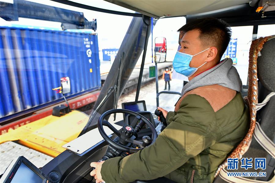 山西中鼎物流园的工作人员驾驶集装箱正面起重机往X9235次中亚班列上装运集装箱(2月26日摄)。新华社记者 曹阳 摄