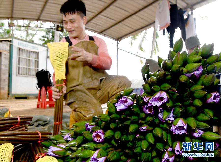 2月27日,海口市永群村花农在打包睡莲。 近日,在做好新冠肺炎疫情防控的同时,海南花农抓紧农时,积极恢复生产。近年来海南省花卉产业快速发展,已成为全国热带花卉和反季节花卉的主要生产基地。 新华社记者 赵颖全 摄