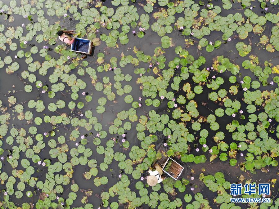 2月27日,海口市永群村花农在田里采摘睡莲(无人机照片)。 近日,在做好新冠肺炎疫情防控的同时,海南花农抓紧农时,积极恢复生产。近年来海南省花卉产业快速发展,已成为全国热带花卉和反季节花卉的主要生产基地。 新华社发(张丽芸摄)
