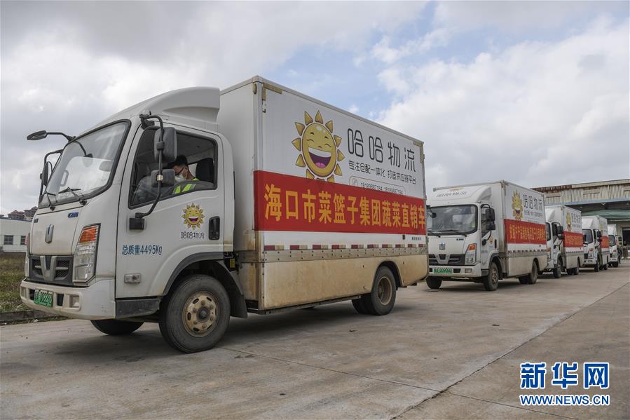 在海口菜篮子集团位于海口的仓储基地,配送车队即将出发配送蔬果、猪肉(2月27日摄)。 新华社发(蒲晓旭摄)