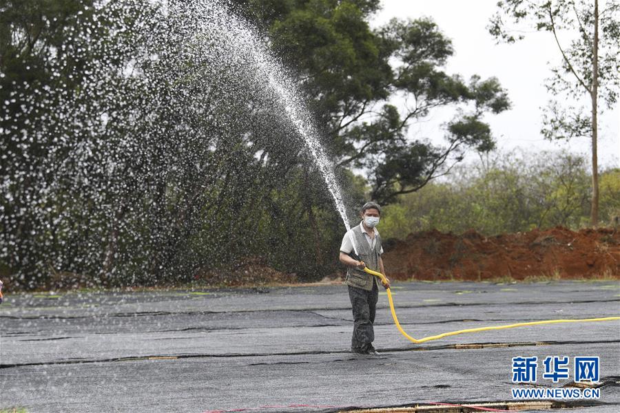 2月28日,广西桂平市石龙镇水稻秧苗培育基地的工人为秧苗浇水。新华社记者 曹祎铭 摄