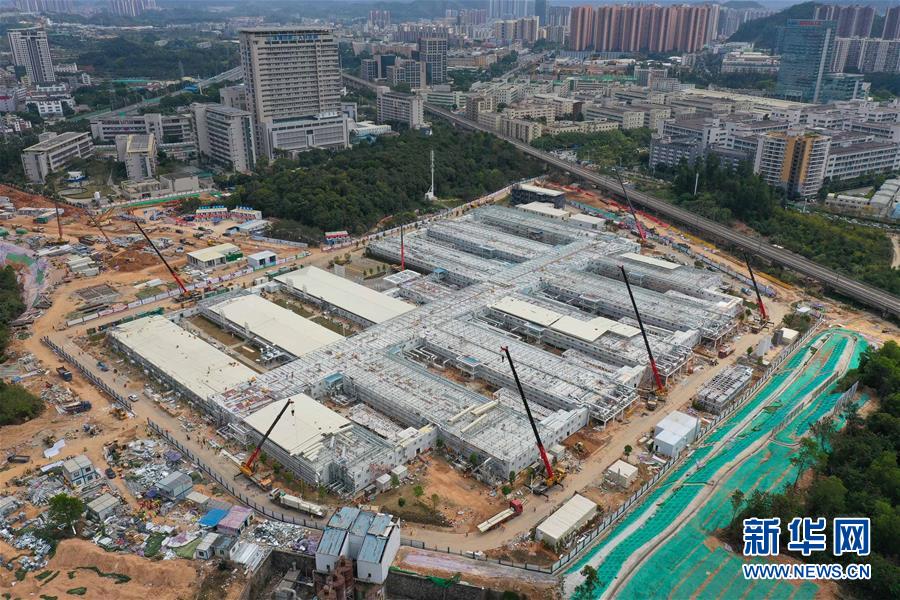 这是深圳市第三人民医院应急院区项目建设完成的无人机照片(2月28日摄,无人机照片)。 为防控新冠肺炎疫情,经中建集团近万名建设者历时20天的昼夜奋战,深圳市第三人民医院二期工程应急院区项目基本建设完成,即将于2月29日交付医院。深圳市本着“宁可备而不用,不可用而不备”原则加快建设的应急院区项目建筑面积5.9万平方米,主要包括隔离区、限制区、生活区、研究区等四个功能区,其中隔离区为2362个箱体板房,可提供1000张护理床位。 新华社记者刘大伟摄