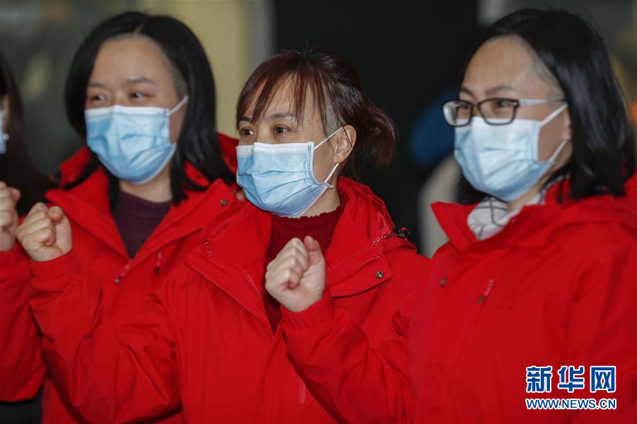 2月28日,在重庆北站,重庆市第十八批支援湖北医疗队队员在登车前为自己加油。 当日,重庆市第十八批支援湖北医疗队从重庆北站出发。此次医疗队的30名医护人员由呼吸科和重症医学科各15名高级职称医师组成,将前往湖北孝感进行对口支援。 新华社发(黄伟 摄)