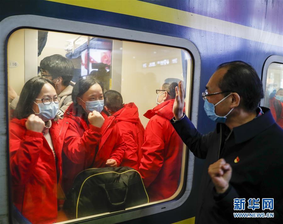 2月28日,在重庆北站,重庆市第十八批支援湖北医疗队队员在列车上与前来送行的同事告别。 当日,重庆市第十八批支援湖北医疗队从重庆北站出发。此次医疗队的30名医护人员由呼吸科和重症医学科各15名高级职称医师组成,将前往湖北孝感进行对口支援。 新华社发(黄伟 摄)