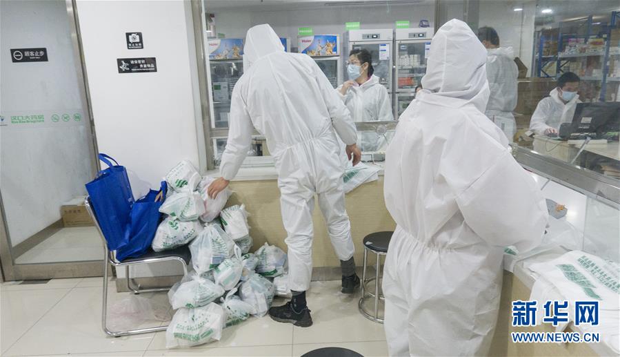 2月27日,在武汉市汉口大药房黄石路店,社区工作人员在取药。 新华社记者才扬摄