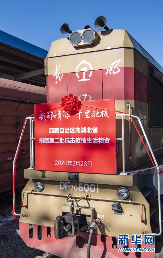 2月28日,装载西藏向湖北捐赠的生活物资的专列准备从拉萨出发。新华社发(彭虹摄)