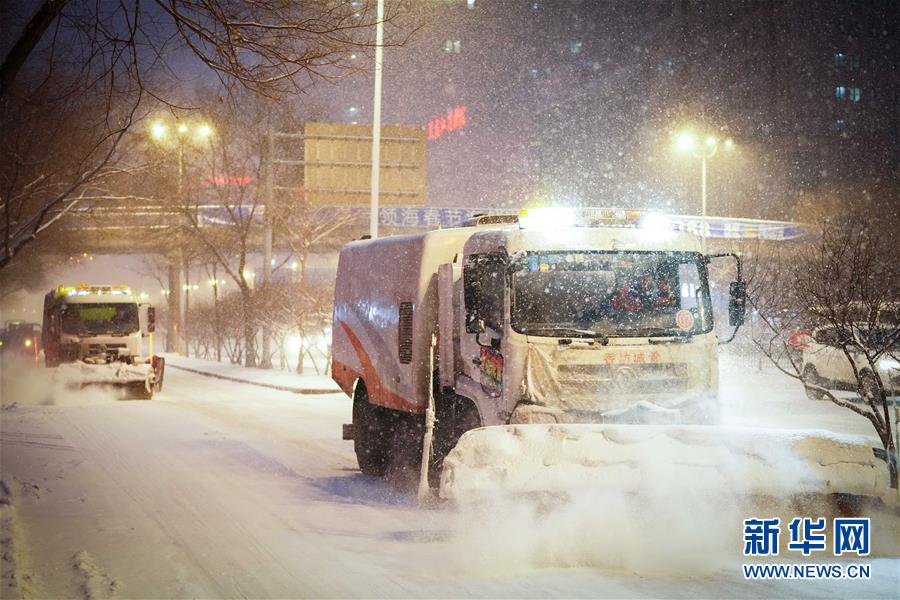 2月28日,清雪车辆在哈尔滨市的一条马路上作业。新华社记者 王松 摄