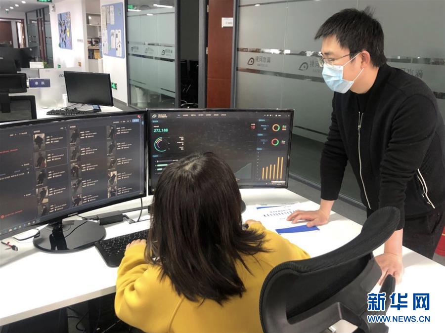 2月25日,“银河水滴”创始人黄永祯和软件团队成员在办公室测试最新升级版的步态识别效果。 新华社发