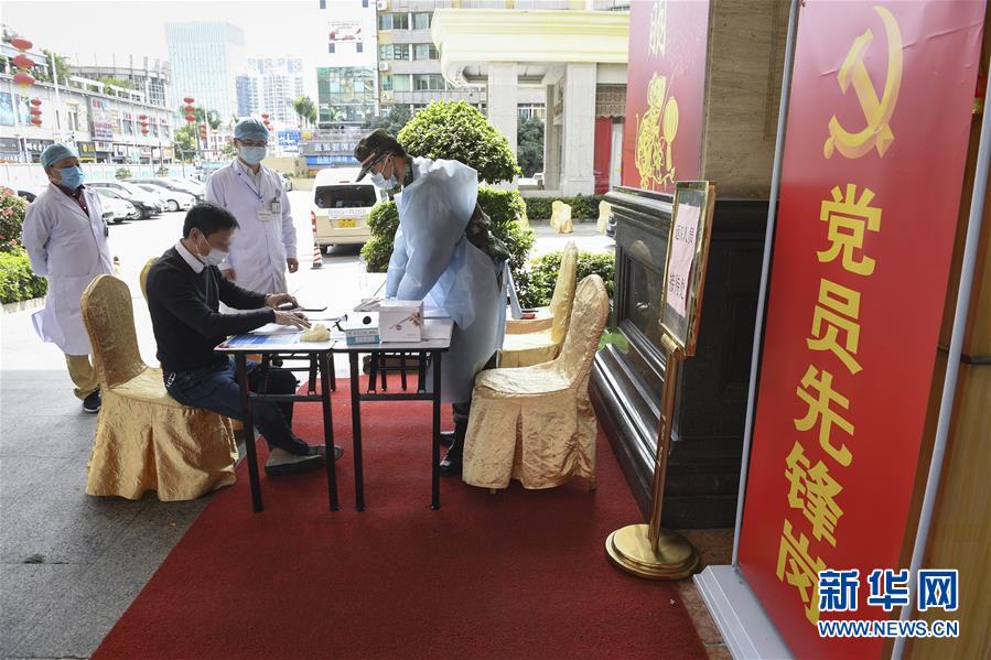 2月27日,于国桥(右二)在武汉市汉口大药房黄石路店为社区患者办理取药手续。