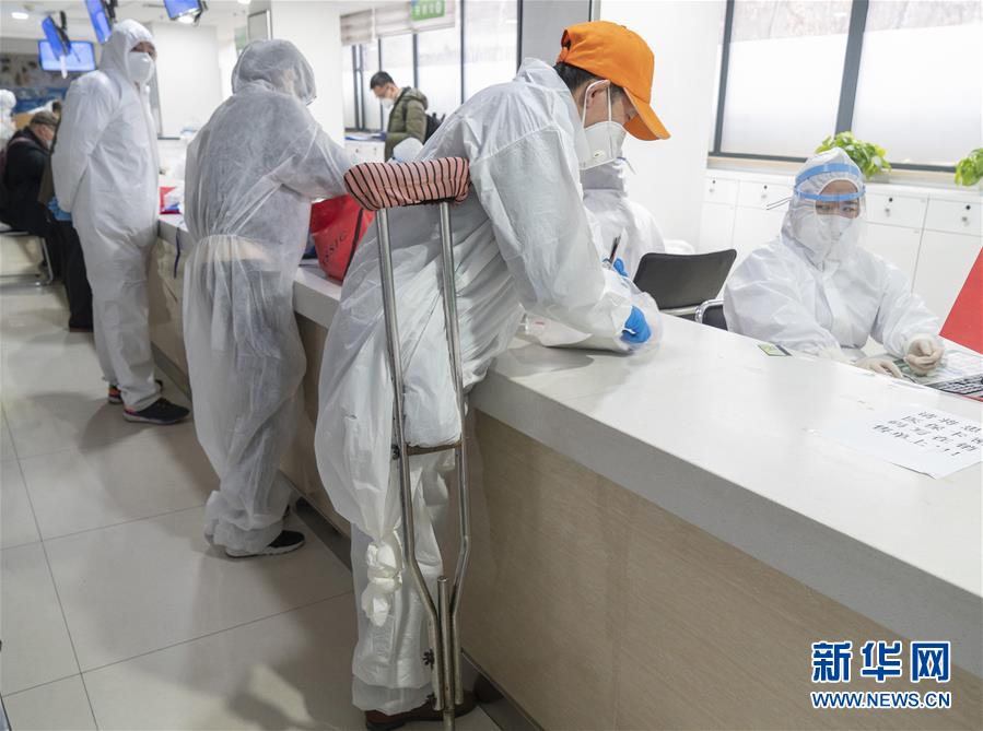 2月27日,于国桥(前右)在武汉市汉口大药房黄石路店为社区患者办理取药手续。新华社记者 才扬 摄