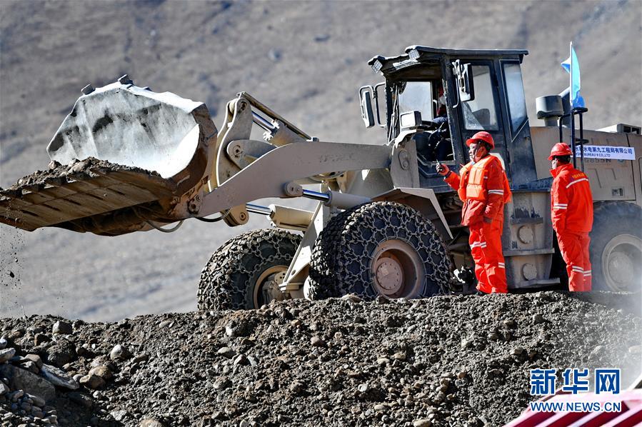 2月28日,施工人员在截流现场指挥大型施工设备。 新华社记者 刘洪明 摄