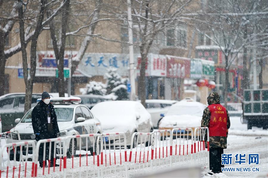 2月29日,哈尔滨市香坊区一卡点的志愿者在雪中坚守岗位。 近日,黑龙江哈尔滨市连遇降雪天气,在市区各个新冠肺炎疫情防疫检查卡点,工作人员和志愿者们不畏风雪,坚守岗位。 新华社记者 王建威 摄