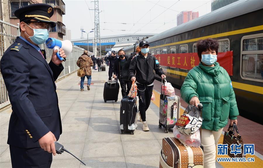 3月1日,务工人员在平顶山火车站乘坐务工专列返岗复工。 当日,来自河南省平顶山市的近700名务工人员,乘坐务工专列前往杭州、宁波、绍兴等地返岗复工。 新华社发(王双正 摄)
