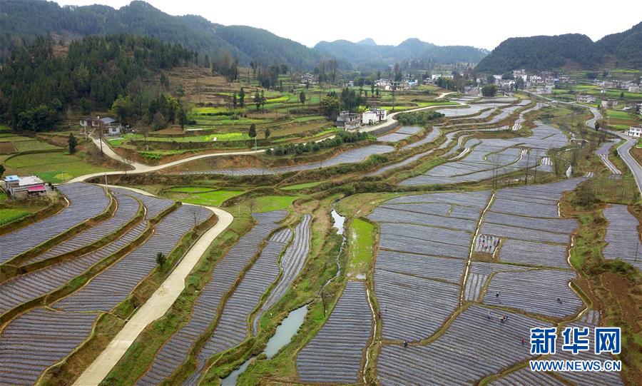 2月29日,农民在贵州省铜仁市德江县复兴镇喻家桥坝区的地里种植西兰花(无人机照片)。 近日,贵州各地农民抢抓农时积极开展春耕生产,田间地头一片繁忙景象。 新华社记者 杨文斌 摄