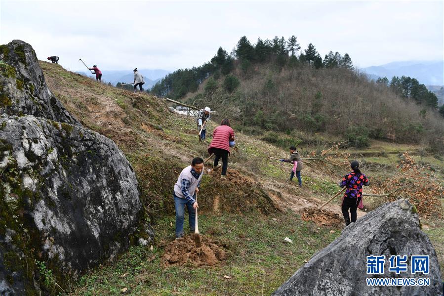 2月29日,农民在贵州省遵义市务川仡佬族苗族自治县丰乐镇新场村的荒坡上移栽花椒树。 近日,贵州各地农民抢抓农时积极开展春耕生产,田间地头一片繁忙景象。 新华社记者 杨文斌 摄