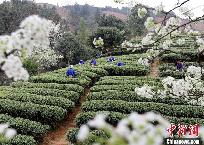 梨花与茶园中嫩绿的茶叶相互映衬。 吴练勋 摄